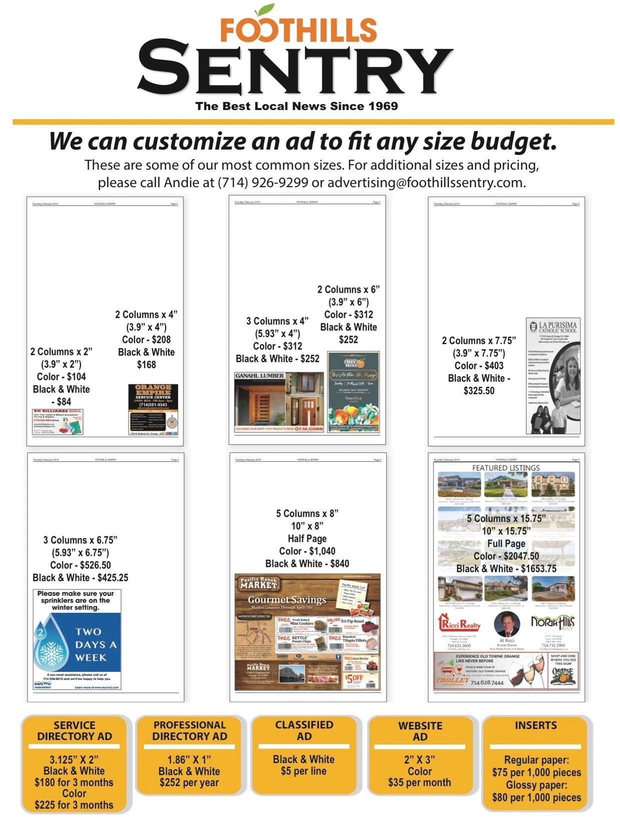 If you are interested in advertising with us, please call us at 714-532-4406, or email at advertising@foothillssentry.com.